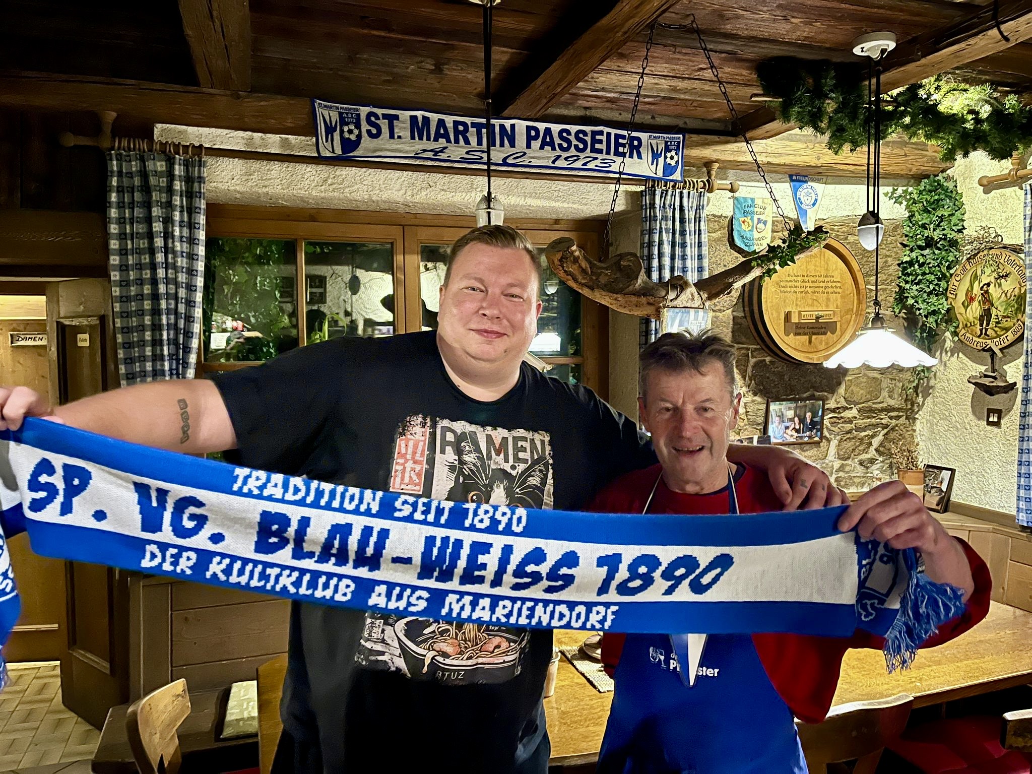 In der Grillstube seines langjährigen Freundes Karl in Südtirol kam es zu einer schönen Geste: Paul überreichte ihm einen Schal sowie einen Wimpel unserer Sp.Vg. Blau-Weiß 1890. Karl ist ein großer Fußballfan und interessiert sich schon lange für den deutschen Fußball. Dank der regelmäßigen historischen Stadionführungen durch Andreas Thome konnte Paul ihm zuvor nicht nur Fakten, sondern vor allem die Geschichte und Tradition von Blau-Weiß 90 näherbringen.